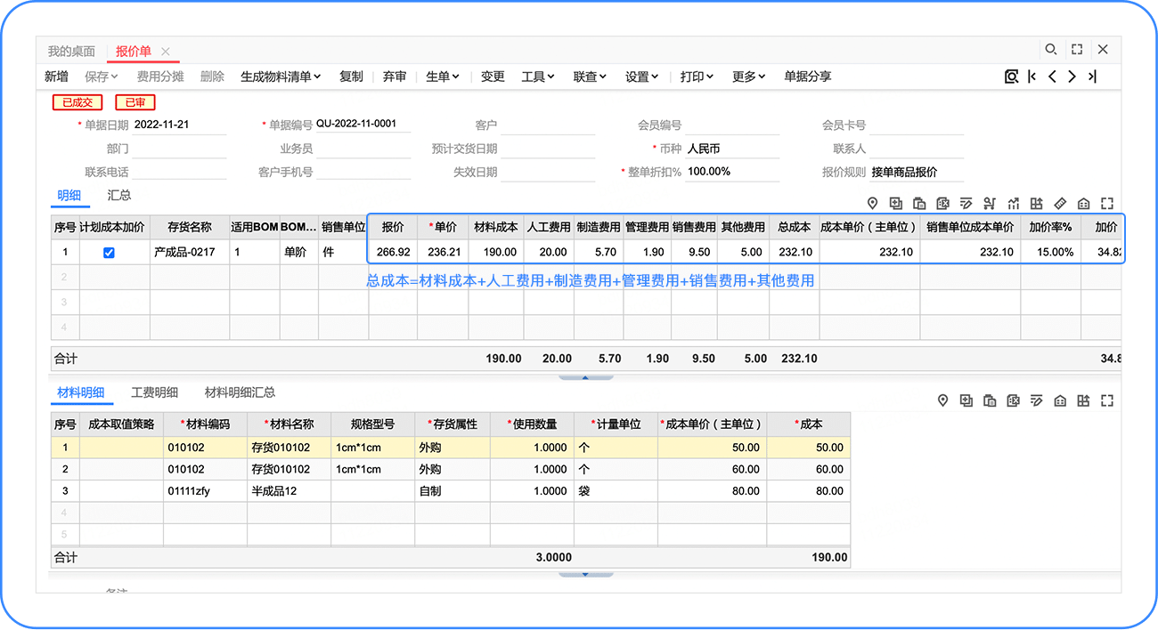 4)系统会根据【报价规则】中设置的料、工、费的取值策略,计算成本信息。即:总成本=材料成本合计+工费成本合计+制造费用+管理费+销售费+其他费用。