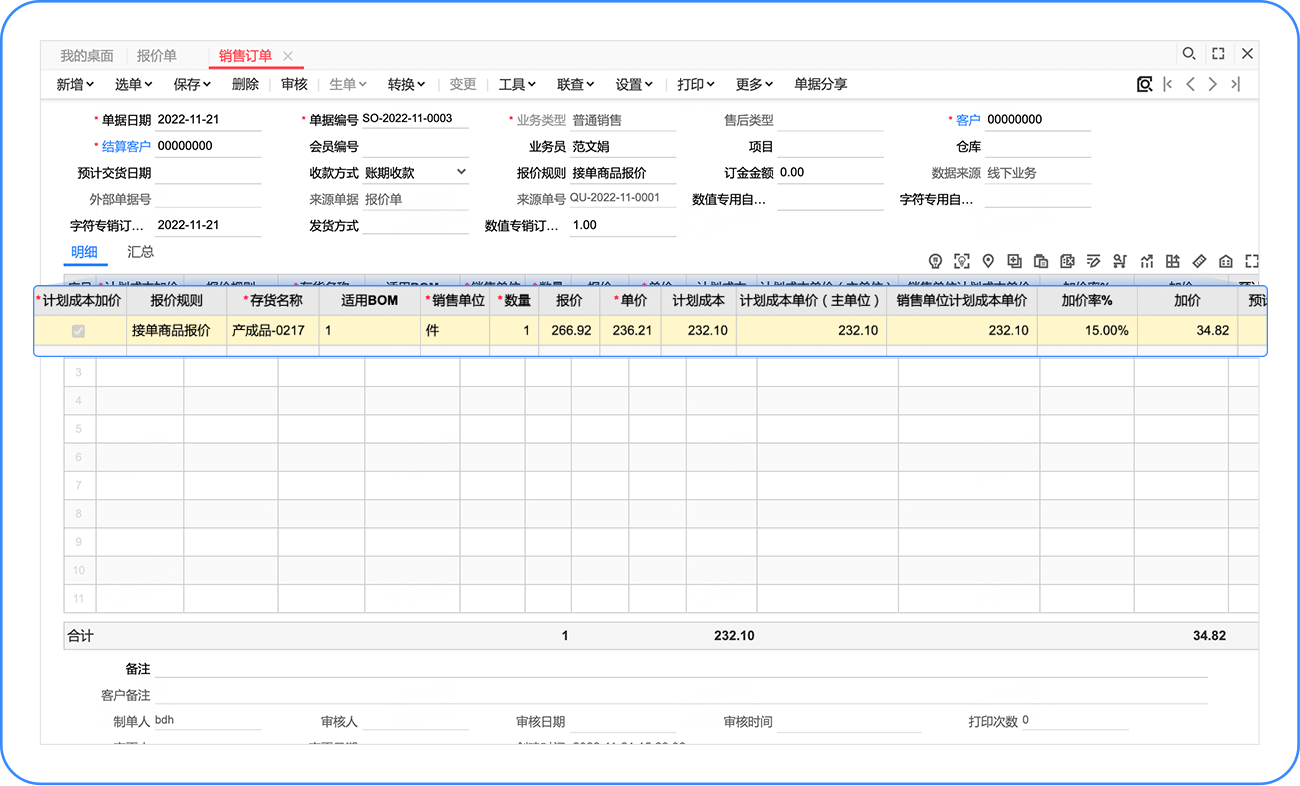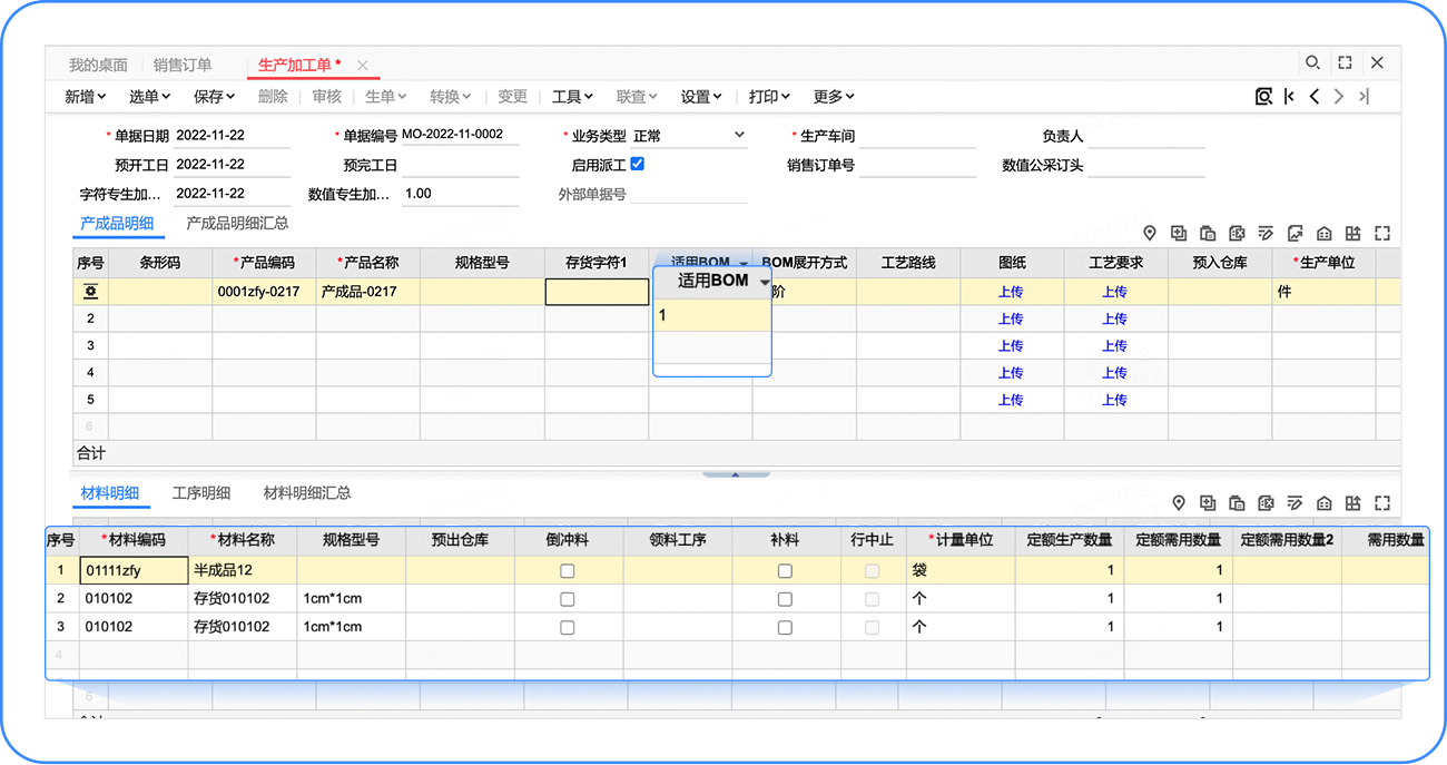 报价单生成销售订单后,销售订单中的适用BOM,价格信息同报价单。此时可以生成生产加工单,按照BOM信息执行生产加工。