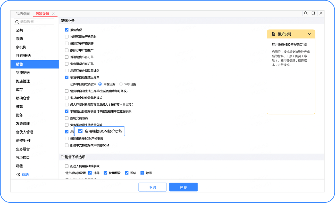 在系统管理-选项设置-销售选项中,启用【启用根据BOM报价功能】的选项,启用后可以使用本次新增功能。在账套内没有包含材料明细的报价单存在时,允许反启用。